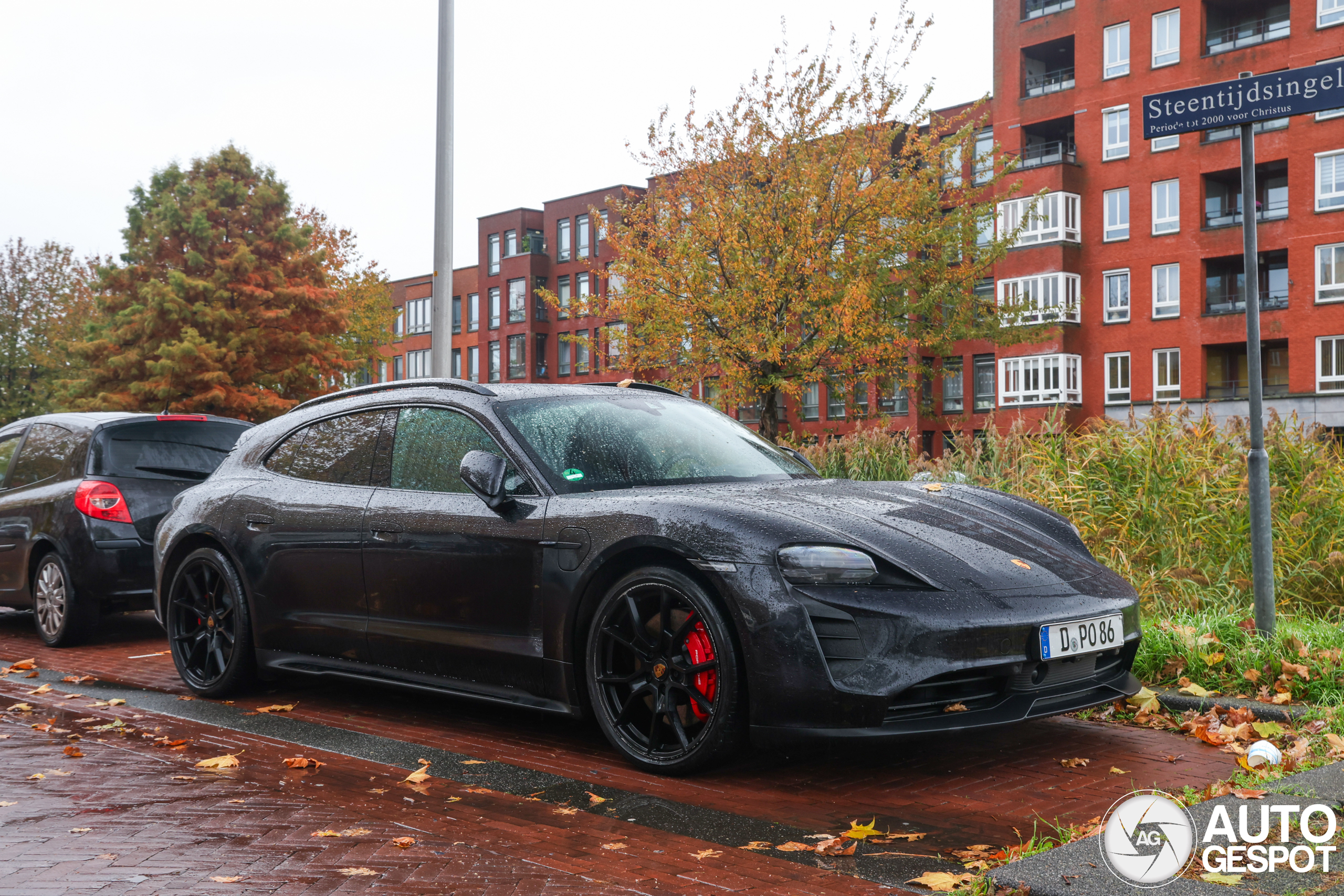 Leuk om te zien dat deze elektrische Taycan ook in Düsseldorf is gespot. Hij had wel flink een stoeprandje te pakken gehad.