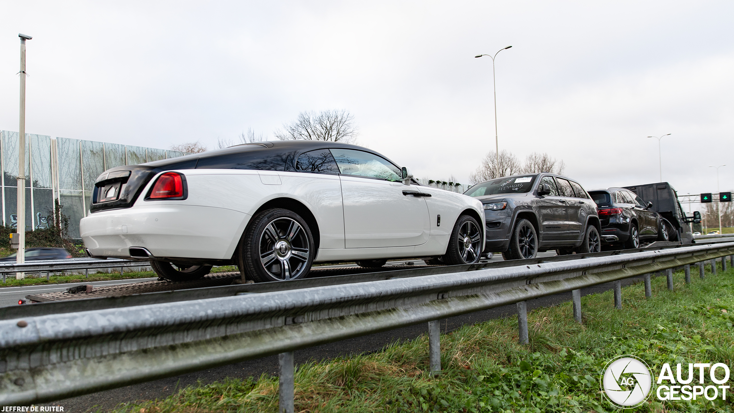 Ongekend. Ik zie wel vaker een Pools trailer met exoten, maar nog nooit een waarvan de trekkende auto eigenlijk ook een wrak is. Uit de losse pols op de gok wat plaatjes gemaakt van 2 banen er naast. Net veel later toen ik er voorbij was zag ik in mijn binnenspiegel dat deze combinatie zomaar een baan naar links opschoof, terwijl hij zelf vrij baan had. Het werd snel duidelijk waarom. Er kwam een flinke lap rubber voorbij zetten. Klapband. Hij moest de vluchtstrook dus op en ik weet dat daar een landweggetje langs loopt. Even snel zoeken hoe ik daar kwam en daar stond hij hoor. Wachtend in de cabine. Linker achterband volledig uit elkaar gespat. Snel wat plaatjes gemaakt, want totaal geen zin in een woordenwisseling met een chagrijnige Pool. Hierbij zijn de twee snelle achterkantjes niet helemaal scherp op de juiste plek. Maar wel het benodigde voorkantje gescoord en een sterk verhaal.